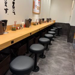 店内は共通の白基調の明るく奥行きのある、今日現在壁向きカウンター15席に4人掛けテーブルが3卓、2人掛けテーブル席が6卓あり氷入りお水は出して頂きました(席下に荷物カゴ、奥にお手洗いあり)。