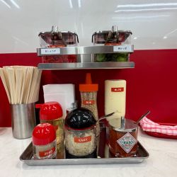 店内はちゃん系共通のの紅.白基調のコンパクトな、今日現在下に荷物用フックのある両壁向きカウンター6席6席の計12席のみでお水は奥左側の冷水機にてセルフ(お手洗いは見当たりません)。