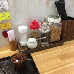 店内はクリーム色基調でコンパクトな、今日現在下に棚のあるコの字カウンター10席のみでお水は出して頂きました(壁側にハンガー掛け、右奥にお手洗いあり)。